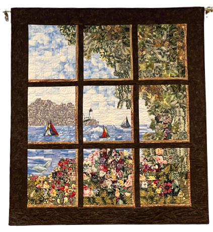 Later when I was decorating my own residence, I began thinking that a quilt above my bed in the master bedroom would be ideal. Considering we live in an earthquake-prone area, I did not want to experience an earthquake at night and have a wood framed picture, for example, fall off the wall during the shaking. I figured something soft that wouldn’t break, or hurt anything it fell on, would be most appropriate for that space. I have always enjoyed going to craft fairs and admiring the creativity of the artists, and I found a local quilter whose quilts I really liked. I frequented her booth whenever she displayed her wares at a local craft fair. One day she displayed a quilt of the appropriate size for my bedroom wall. The quilt appeared to be a nine-pane glass window through which you could view a scene of sailboats on a lake, a large rocky cliff with a lighthouse on it to guide the sailors, and in the foreground some trees and a garden with many blooming flowers. If you looked closely at the small individual quilt squares, you could find some bunnies, various birds, a kitten and a duck in the fabrics used to create the garden scene. I bought it then and there, have it on my bedroom wall to this day, and I still love it.